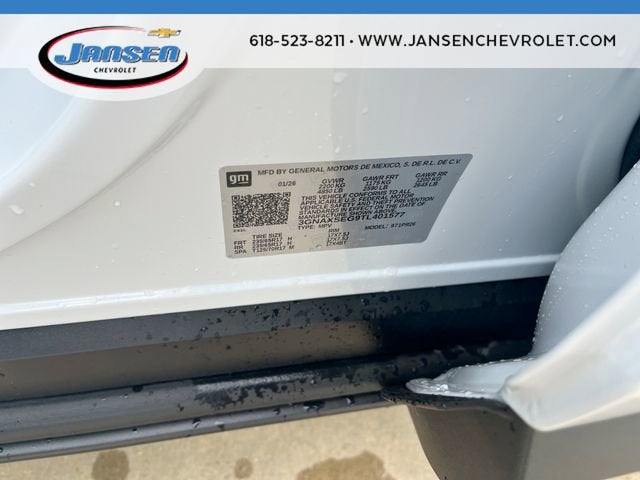 The Jansen Advantage: Complimentary Carfax on all vehicles, Complimentary Service Loaners, Complimentary Oil Change, Service Rewards Program, and Complimentary Local Pickup and Delivery. 1.5L DOHC AWD Polar White Tricoat 2-Way Power Driver Lumbar Control Seat Adjuster, 3.47 Final Drive Axle Ratio, 4-Wheel Disc Brakes, 6 Speakers, ABS brakes, Air Conditioning, Alloy wheels, AM/FM radio: SiriusXM, Auto High-beam Headlights, Automatic temperature control, Brake assist, Bumpers: body-color, Compass, Convenience Package III, Cruise Control, Delay-off headlights, Driver 8-Way Power Seat Adjuster, Driver door bin, Driver vanity mirror, Dual front impact airbags, Dual front side impact airbags, Electronic Stability Control, Emergency communication system: OnStar and Chevrolet connected services capable, Four wheel independent suspension, Front anti-roll bar, Front Bucket Seats, Front Center Armrest, Front dual zone A/C, Front Fog Lamps, Front Passenger 2-Way Power Lumbar Seat Adjuster, Front Passenger 4-Way Manual Seat Adjuster, Front Passenger 8-Way Power Seat Adjuster, Front reading lights, Fully automatic headlights, Garage door transmitter, HD Surround Vision, Heated door mirrors, Heated Driver and Front Passenger Seats, Heated front seats, Heated Rear Outboard Seating Positions, Heated steering wheel, Illuminated entry, Low tire pressure warning, Memory Settings, Navigation System, Occupant sensing airbag, Outside temperature display, Overhead airbag, Overhead console, Panic alarm, Passenger door bin, Passenger vanity mirror, Power door mirrors, Power driver seat, Power Liftgate, Power steering, Power windows, Premium audio system: Chevrolet Infotainment 3 Plus, Radio data system, Radio: 11.3 Diagonal Advanced Color LCD Display, Rain sensing wipers, Rear anti-roll bar, Rear Camera Mirror Washer, Rear Pedestrian Alert, Rear reading lights, Rear seat center armrest, Rear window defroster, Rear window wiper, Remote keyless entry, Safety and Technology Package, Security system, SiriusXM with 360L Trial Subscription, Speed-sensing steering, Split folding rear seat, Spoiler, Steering wheel mounted audio controls, Sueded Microfiber Seat Trim, Tachometer, Telescoping steering wheel, Tilt steering wheel, Traction control, Traffic Sign Recognition, Trip computer, Variably intermittent wipers, Ventilated Driver Seat, Ventilated Front Passenger Seat, Wheels: 17 Dark Android Painted Machined-Face. 25/29 City/Highway MPG