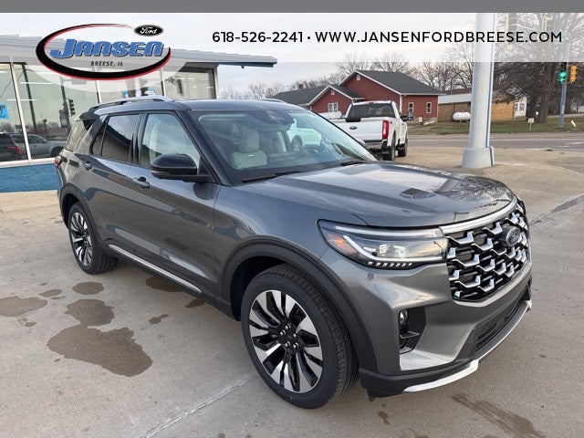 Carbonized Gray Metallic 2026 Ford Explorer Platinum 4WD 10-Speed Automatic 2.3L EcoBoost I-4 14 Speakers, 3rd row seats: bench, 4-Wheel Disc Brakes, ABS brakes, ActiveX Trimmed Captain's Chairs, Air Conditioning, Alloy wheels, AM/FM radio: SiriusXM with 360L, Apple CarPlay/Android Auto, Auto High-beam Headlights, Auto-dimming door mirrors, Auto-dimming Rear-View mirror, Automatic temperature control, Brake assist, Bumpers: body-color, Compass, Delay-off headlights, Driver door bin, Driver vanity mirror, Dual front impact airbags, Dual front side impact airbags, Electronic Stability Control, Emergency communication system: 911 Assist, Equipment Group 600A Standard Package, Exterior Parking Camera Rear, Four wheel independent suspension, Front anti-roll bar, Front Bucket Seats, Front Center Armrest, Front dual zone A/C, Front fog lights, Front reading lights, Fully automatic headlights, Garage door transmitter, Heated door mirrors, Heated front seats, Heated rear seats, Heated steering wheel, Illuminated entry, Knee airbag, Leather steering wheel, Low tire pressure warning, Lux Leather Package, Memory seat, Navigation System, Occupant sensing airbag, Outside temperature display, Overhead airbag, Overhead console, Panic alarm, Panoramic Fixed Glass Roof with Power Shade, Passenger door bin, Passenger vanity mirror, Platinum Badges on Front Row Seats, Power door mirrors, Power driver seat, Power Liftgate, Power passenger seat, Power steering, Power windows, Premium Leather Seating Surfaces Captain's Chairs, Quilting and Stitching on Door Panels, Quilting and Stitching on Seats, Radio data system, Radio: B&O Sound System by Bang & Olufsen with HD, Rain sensing wipers, Rear air conditioning, Rear anti-roll bar, Rear reading lights, Rear window defroster, Rear window wiper, Remote keyless entry, SecuriCode Keyless Entry Keypad, Security system, Speed control, Speed-sensing steering, Speed-Sensitive Wipers, Split folding rear seat, Spoiler, Steering wheel mounted audio controls, Tachometer, Telescoping steering wheel, Tilt steering wheel, Traction control, Trip computer, Turn signal indicator mirrors, Variably intermittent wipers, Ventilated front seats, Wheels: : 21 Bright Machined Aluminum w/Tarnish Dark Pockets, Wheels: 20 Luster Nickel-Painted Aluminum.