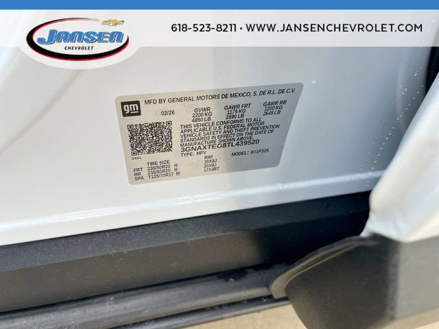 The Jansen Advantage: Complimentary Carfax on all vehicles, Complimentary Service Loaners, Complimentary Oil Change, Service Rewards Program, and Complimentary Local Pickup and Delivery. 1.5L DOHC AWD Polar White Tricoat 2-Way Power Driver Lumbar Control Seat Adjuster, 3.47 Final Drive Axle Ratio, 4-Wheel Disc Brakes, 6 Speakers, ABS brakes, Air Conditioning, Alloy wheels, AM/FM radio: SiriusXM, Auto High-beam Headlights, Automatic temperature control, Brake assist, Bumpers: body-color, Compass, Convenience Package III, Cruise Control, Delay-off headlights, Driver 8-Way Power Seat Adjuster, Driver door bin, Driver vanity mirror, Dual front impact airbags, Dual front side impact airbags, Electronic Stability Control, Emergency communication system: OnStar and Chevrolet connected services capable, Evotex Seat Trim, Four wheel independent suspension, Front anti-roll bar, Front Bucket Seats, Front Center Armrest, Front dual zone A/C, Front Fog Lamps, Front Passenger 2-Way Power Lumbar Seat Adjuster, Front Passenger 4-Way Manual Seat Adjuster, Front Passenger 8-Way Power Seat Adjuster, Front reading lights, Fully automatic headlights, Garage door transmitter, HD Surround Vision, Heated door mirrors, Heated Driver and Front Passenger Seats, Heated front seats, Heated Rear Outboard Seating Positions, Heated steering wheel, Illuminated entry, Low tire pressure warning, Memory Settings, Navigation System, Occupant sensing airbag, Outside temperature display, Overhead airbag, Overhead console, Panic alarm, Passenger door bin, Passenger vanity mirror, Power door mirrors, Power driver seat, Power Liftgate, Power steering, Power windows, Premium audio system: Chevrolet Infotainment 3, Radio data system, Radio: 11.3 Diagonal Advanced Color LCD Display, Rain sensing wipers, Rear anti-roll bar, Rear Camera Mirror Washer, Rear Pedestrian Alert, Rear reading lights, Rear seat center armrest, Rear window defroster, Rear window wiper, Remote keyless entry, Safety and Technology Package, Security system, SiriusXM with 360L Trial Subscription, Speed-sensing steering, Split folding rear seat, Spoiler, Sport steering wheel, Steering wheel mounted audio controls, Tachometer, Telescoping steering wheel, Tilt steering wheel, Traction control, Traffic Sign Recognition, Trip computer, Variably intermittent wipers, Ventilated Driver Seat, Ventilated Front Passenger Seat, Wheels: 19 Carbon Flash Metallic Aluminum, Wheels: 20 Black Machined-Face Aluminum. 25/29 City/Highway MPG