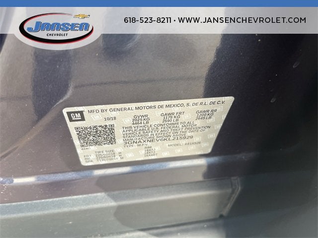 2019 Chevrolet Equinox PremierClean CARFAX. CARFAX One-Owner.26/32 City/Highway MPGOdometer is 58377 miles below market average!Priced below KBB Fair Purchase Price!The Jansen Advantage: Complimentary Carfax on all vehicles, Complimentary Service Loaners, Complimentary Oil Change, Service Rewards Program, and Complimentary Local Pickup and Delivery.Jansen Chevrolet has been in business since 1927. The foundation of our business is customer service. We strive to treat every customer with courtesy and respect, that's why our motto is Come as a Customer, Leave as a Friend! Give us a chance to show you why we have been around for nearly 100 years.18 Aluminum Wheels, 2 Rear USB Charging-Only Ports, 2 USB Data Ports, 2 USB Data Ports w/SD Card Reader, 2-Way Power Driver Lumbar Control Seat Adjuster, 3.50 Final Drive Axle Ratio, 4-Wheel Disc Brakes, 6 Speaker Audio System Feature, 6 Speakers, 8-Way Power Driver Seat Adjuster, 8-Way Power Front Passenger Seat Adjuster, ABS brakes, Adaptive Cruise Control - Camera, Air Conditioning, Alloy wheels, AM/FM radio: SiriusXM, Apple CarPlay/Android Auto, Auto-dimming door mirrors, Auto-dimming Rear-View mirror, Automatic temperature control, Bluetooth® For Phone, Brake assist, Bumpers: body-color, Compass, Confidence & Convenience II Package, Cruise Control, Custom Molded Rear Splash Guards (LPO), Delay-off headlights, Driver Confidence II Package, Driver Convenience II Package, Driver door bin, Driver vanity mirror, Dual front impact airbags, Dual front side impact airbags, Electronic Stability Control, Emergency communication system: OnStar and Chevrolet connected services capable, Following Distance Indicator, Forward Collision Alert, Four wheel independent suspension, Front anti-roll bar, Front Bucket Seats, Front Center Armrest, Front dual zone A/C, Front fog lights, Front Passenger 4-Way Manual Seat Adjuster, Front Pedestrian Braking, Front reading lights, Fully automatic headlights, Garage door transmitter, HD Surround Vision, Heated door mirrors, Heated Driver & Front Passenger Seats, Heated front seats, Heated Rear Seats, Heated Steering Wheel, Horizontal Cargo Net (LPO), Illuminated entry, IntelliBeam Auto High Beam Headlamp Control, Lane Keep Assist w/Lane Departure Warning, Leather Shift Knob, Low Speed Forward Automatic Braking, Low tire pressure warning, Memory seat, Occupant sensing airbag, Outside temperature display, Overhead airbag, Overhead console, Panic alarm, Passenger door bin, Passenger vanity mirror, Perforated Leather-Appointed Seat Trim, Power door mirrors, Power driver seat, Power Liftgate, Power steering, Power windows, Preferred Equipment Group 1LZ, Premium audio system: Chevrolet MyLink, Radio data system, Radio: Chevrolet Infotainment 3 Plus System, Rear anti-roll bar, Rear reading lights, Rear seat center armrest, Rear window defroster, Rear window wiper, Remote keyless entry, Roof rack: rails only, Safety Alert Seat, Security system, SiriusXM Radio, Speed-sensing steering, Split folding rear seat, Spoiler, Steering wheel mounted audio controls, Tachometer, Telescoping steering wheel, Tilt steering wheel, Traction control, Trip computer, Turn signal indicator mirrors, Variably intermittent wipers, Ventilated Driver Seat, Ventilated Front Passenger Seat.
