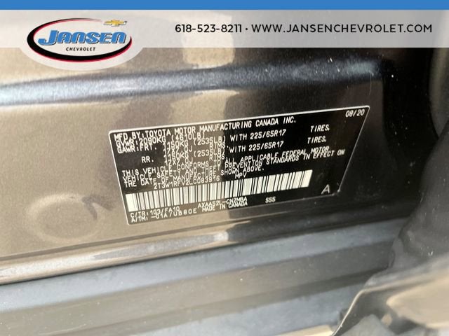 2020 Toyota RAV4 XLECARFAX One-Owner.28/35 City/Highway MPGThe Jansen Advantage: Complimentary Carfax on all vehicles, Complimentary Service Loaners, Complimentary Oil Change, Service Rewards Program, and Complimentary Local Pickup and Delivery.Jansen Chevrolet has been in business since 1927. The foundation of our business is customer service. We strive to treat every customer with courtesy and respect, that's why our motto is Come as a Customer, Leave as a Friend! Give us a chance to show you why we have been around for nearly 100 years.4-Wheel Disc Brakes, 6 Speakers, ABS brakes, Air Conditioning, Alloy wheels, AM/FM radio: SiriusXM, AM/FM Stereo, Apple CarPlay/Android Auto, Auto High-beam Headlights, Automatic temperature control, Axle Ratio: 3.177, Brake assist, Bumpers: body-color, Cruise Control, Delay-off headlights, Driver door bin, Driver vanity mirror, Dual front impact airbags, Dual front side impact airbags, Electronic Stability Control, Emergency communication system: Entune Safety Connect, Exterior Parking Camera Rear, Fabric Seat Trim, Four wheel independent suspension, Front anti-roll bar, Front Bucket Seats, Front Center Armrest, Front dual zone A/C, Front fog lights, Front reading lights, Fully automatic headlights, Heated door mirrors, Illuminated entry, Knee airbag, Low tire pressure warning, Occupant sensing airbag, Outside temperature display, Overhead airbag, Overhead console, Panic alarm, Passenger door bin, Passenger vanity mirror, Power door mirrors, Power driver seat, Power steering, Power windows, Radio data system, Rear anti-roll bar, Rear seat center armrest, Rear window defroster, Rear window wiper, Remote keyless entry, Roof rack: rails only, Speed-sensing steering, Split folding rear seat, Spoiler, Steering wheel mounted audio controls, Tachometer, Telescoping steering wheel, Tilt steering wheel, Traction control, Trip computer, Turn signal indicator mirrors, Variably intermittent wipers, Wheels: 17 5-Spoke Silver Alloy.