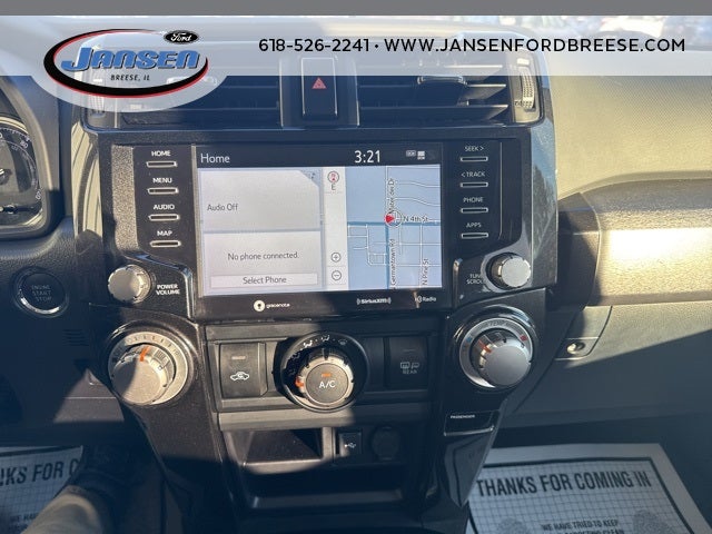 3.727 Axle Ratio, 4-Wheel Disc Brakes, 8 Speakers, ABS brakes, Air Conditioning, Alloy wheels, AM/FM radio: SiriusXM, Anti-whiplash front head restraints, Apple CarPlay/Android Auto, Auto High-beam Headlights, Auto-dimming Rear-View mirror, Black Roof Rails, Body Color Heated Mirrors, Brake assist, Bumpers: body-color, Compass, Driver door bin, Driver vanity mirror, Dual front impact airbags, Dual front side impact airbags, Electronic Stability Control, Emergency communication system: Safety Connect with 1-year trial, Exterior Parking Camera Rear, Front anti-roll bar, Front Bucket Seats, Front Center Armrest, Front fog lights, Front reading lights, Front wheel independent suspension, Garage Door Opener, Garage door transmitter: HomeLink, Heated door mirrors, Heated front seats, Illuminated entry, Knee airbag, Leather Shift Knob, Leather steering wheel, Low tire pressure warning, Navigation System, Occupant sensing airbag, Outside temperature display, Overhead airbag, Overhead console, Panic alarm, Passenger door bin, Passenger vanity mirror, Power door mirrors, Power driver seat, Power passenger seat, Power steering, Power windows, Radio: Premium Audio w/Dynamic Navigation, Rear anti-roll bar, Rear seat center armrest, Rear window defroster, Rear window wiper, Remote keyless entry, Roof rack, Security system, Softex Synthetic Leather Seat Trim, Speed control, Speed-sensing steering, Split folding rear seat, Spoiler, Steering wheel mounted audio controls, Tachometer, Telescoping steering wheel, Tilt steering wheel, Traction control, Trip computer, Turn signal indicator mirrors, Variably intermittent wipers, Wheels: 17 Matte Black Flow-Formed TRD Alloy.