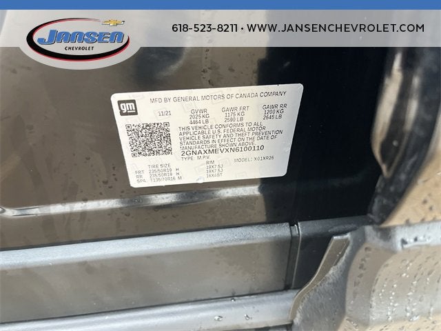 2022 Chevrolet Equinox RSClean CARFAX. CARFAX One-Owner.26/31 City/Highway MPGPriced below KBB Fair Purchase Price!The Jansen Advantage: Complimentary Carfax on all vehicles, Complimentary Service Loaners, Complimentary Oil Change, Service Rewards Program, and Complimentary Local Pickup and Delivery.Jansen Chevrolet has been in business since 1927. The foundation of our business is customer service. We strive to treat every customer with courtesy and respect, that's why our motto is Come as a Customer, Leave as a Friend! Give us a chance to show you why we have been around for nearly 100 years.120-Volt Power Outlet, 19 Aluminum Wheels, 2 Rear USB Charging-Only Ports, 2 USB Data Ports, 2 USB Data Ports w/SD Card Reader, 2 USB Ports & Auxiliary Input Jack, 2-Way Power Driver Lumbar Control Seat Adjuster, 3.50 Final Drive Axle Ratio, 4-Wheel Disc Brakes, 6 Speaker Audio System Feature, 6 Speakers, 8-Way Power Driver Seat Adjuster, ABS brakes, Adaptive Cruise Control, Advanced Safety Package, Air Conditioning, Alloy wheels, AM/FM radio: SiriusXM, Auto High-beam Headlights, Automatic temperature control, Bluetooth® For Phone, Bose Premium 7-Speaker Audio System Feature, Brake assist, Bumpers: body-color, Compass, Cruise Control, Delay-off headlights, Driver door bin, Driver Seatback Map Pocket, Driver vanity mirror, Dual front impact airbags, Dual front side impact airbags, Electronic Stability Control, Emergency communication system: OnStar and Chevrolet connected services capable, Four wheel independent suspension, Front anti-roll bar, Front Bucket Seats, Front Center Armrest, Front dual zone A/C, Front Passenger 4-Way Manual Seat Adjuster, Front reading lights, Fully automatic headlights, HD Surround Vision, Heated door mirrors, Heated Driver & Front Passenger Seats, Heated front seats, Heated Steering Wheel, Illuminated entry, Infotainment Package, Leather steering wheel, Low tire pressure warning, Occupant sensing airbag, Outside Heated Power Adjustable Mirrors, Outside temperature display, Overhead airbag, Overhead console, Panic alarm, Passenger door bin, Passenger vanity mirror, Perforated Leather-Appointed Seat Trim, Power door mirrors, Power driver seat, Power Liftgate, Power steering, Power Sunroof, Power windows, Preferred Equipment Group 1RS, Premium audio system: Chevrolet Infotainment 3, Premium Cloth Seat Trim, Radio data system, Radio: Chevrolet Infotainment 3 Plus System w/Navi, Radio: Chevrolet Infotainment 3 System w/AM/FM, Rear anti-roll bar, Rear reading lights, Rear seat center armrest, Rear window defroster, Rear window wiper, Remote keyless entry, Roof rack: rails only, RS Leather Package, Security system, SiriusXM Radio, Speed-sensing steering, Split folding rear seat, Spoiler, Steering wheel mounted audio controls, Tachometer, Telescoping steering wheel, Tilt steering wheel, Traction control, Trip computer, Variably intermittent wipers, Wireless Apple CarPlay/Wireless Android Auto.