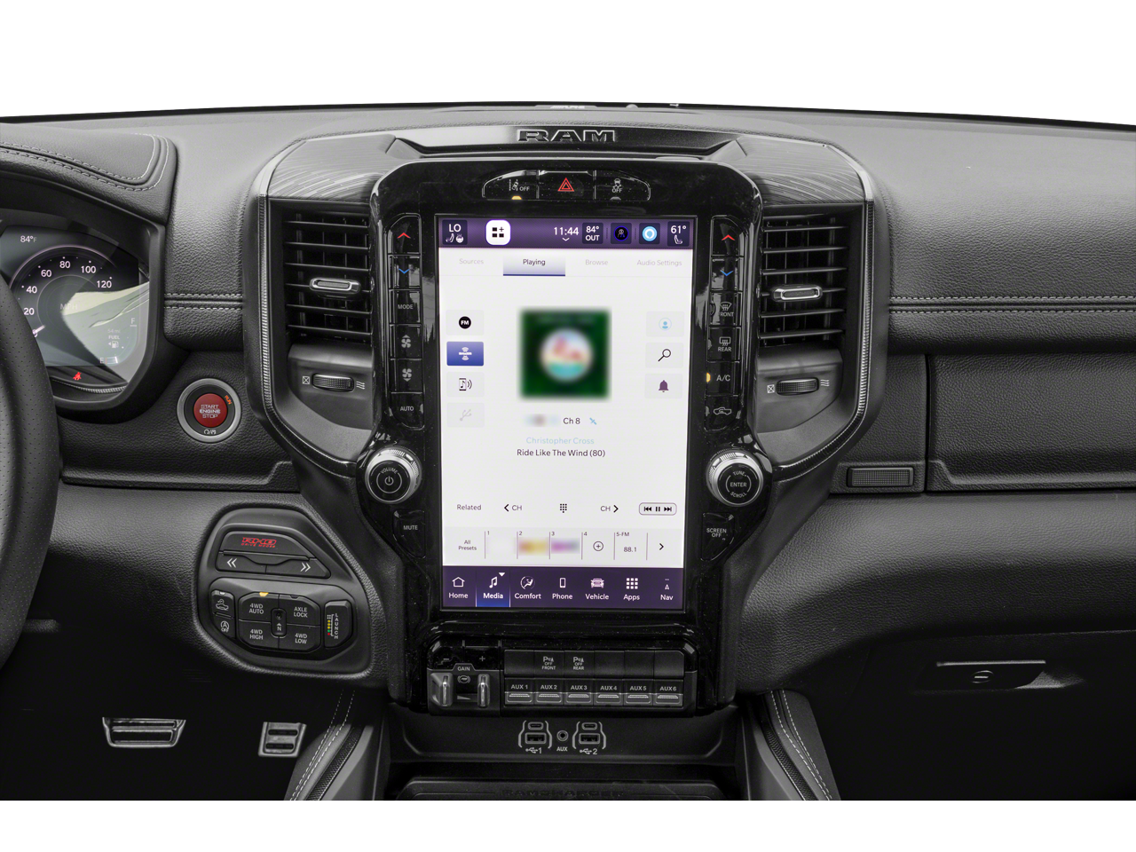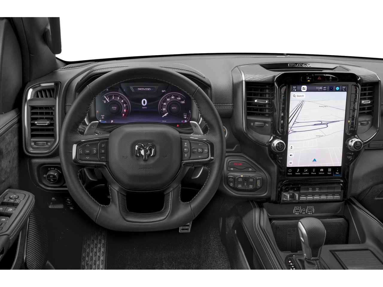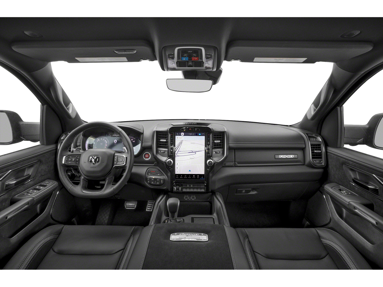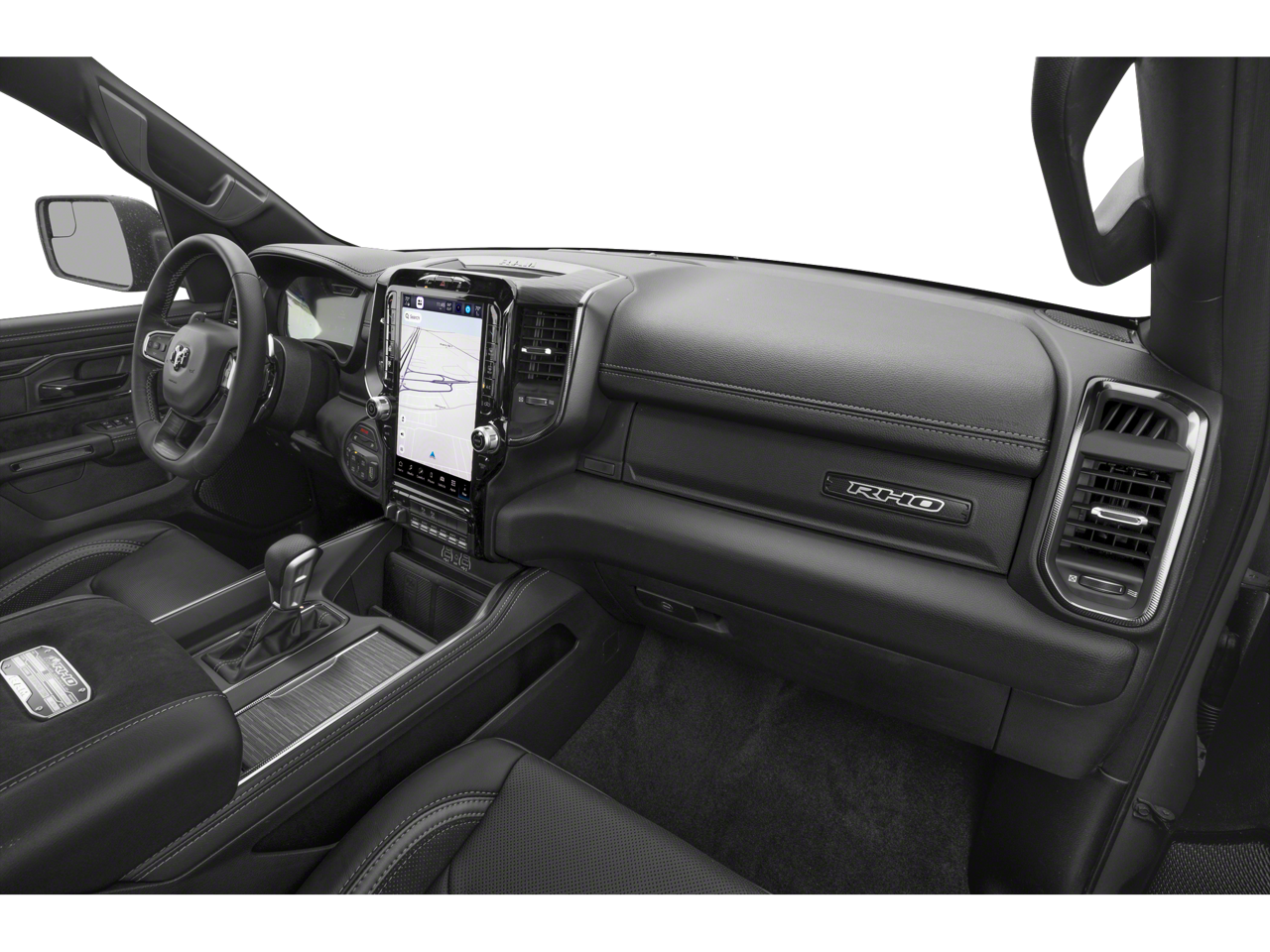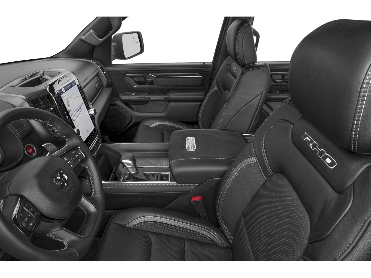 10 Speakers, 12-Way/1-Way Trailer Connector, 14.4 Touchscreen Display, 240 Amp Alternator, 3.92 Rear Axle Ratio, 4-Wheel Disc Brakes, 4G LTE Wi-Fi Hot Spot, ABS brakes, Adaptive suspension, Adjustable pedals, Air Conditioning, Alloy wheels, AM/FM radio, Apple CarPlay/Android Auto, Auto High-beam Headlights, Auto Power-Folding Mirrors, Auto-dimming door mirrors, Auto-Dimming Exterior Driver Mirror, Auto-dimming Rear-View mirror, Automatic temperature control, Bed Utility Group, Brake assist, Compass, Connected Travel and Traffic Services, Connectivity - US/Canada, Delay-off headlights, Disassociated Touchscreen Display, Dome Dual LED Reading Lamp, Driver door bin, Driver Power Seat Back Massage, Driver Seat Memory, Driver vanity mirror, Driver/Passenger Wrapped Assist Handles, Drowsy Driver Detection, Dual front impact airbags, Dual front side impact airbags, Dual Wireless Charging Pad, Dual-Pane Panoramic Sunroof, Electronic Stability Control, Engine Block Heater, Evasive Steer Assist, Exterior 115V AC Outlet, Exterior Mirrors Courtesy Lamps, Exterior Mirrors with Heating Element, Exterior Mirrors with Memory, Exterior Mirrors with Supplemental Signals, Exterior Parking Camera Rear, Flareside Box, Front anti-roll bar, Front Bucket Seats, Front Center Armrest w/Storage, Front dual zone A/C, Front fog lights, Front License Plate Bracket, Front Passenger Interactive Display, Front Passenger Power Seat Back Massage, Front reading lights, Front wheel independent suspension, Full Length Premium Upgraded Floor Console, Fully automatic headlights, Garage door transmitter, GPS Navigation, Hands-Free Active Driving Assist System, Harman/Kardon 19 Speaker Premium Sound, HD Radio, Heads-Up Display, Heated door mirrors, Heated front seats, Heated Second Row Seats, Heated steering wheel, Illuminated entry, Integrated Center Stack Radio, Integrated Voice Command with Bluetooth®, Intersection Collision Assist System, Leather Shift Knob, Leather steering wheel, Leather Trimmed Bucket Seats, Leather/Carbon Flat-Bottom Steering Wheel, LED CHMSL Lamp, Low tire pressure warning, Luxury Front Door Trim Panel, Manufacturer's Statement of Origin, MOPAR 4 Adjustable Cargo Tie-Down Hooks, MOPAR Deployable Bed Step, MOPAR Off-Road Style Running Boards, Navigation System, Occupant sensing airbag, Outside temperature display, Overhead airbag, Overhead console, Panic alarm, Passenger door bin, Passenger vanity mirror, Power Adjustable Pedals with Memory, Power door mirrors, Power driver seat, Power passenger seat, Power steering, Power Tailgate, Power windows, Premium Wrapped Instrument Panel Bezel, Quick Order Package 22Y RHO, Radio data system, Radio: Uconnect 5 Nav with 14.4 Display, Radio: Uconnect 5 Navigation with 12.0 Display, Radio/Driver Seat/Mirrors/Pedals Memory, Rain Sensitive Windshield Wipers, Real Carbon Fiber Interior Accents, Rear 60/40 Folding Split Recline Seat, Rear reading lights, Rear seat center armrest, Rear step bumper, Rear window defroster, Remote keyless entry, RHO Level 1 Equipment Group, Security system, SiriusXM Radio Service, Smartphone as a Key Capable, Speed control, Split folding rear seat, Sport steering wheel, Steering wheel mounted audio controls, Surround View Camera System, Tachometer, Telescoping steering wheel, Tilt steering wheel, Traction co