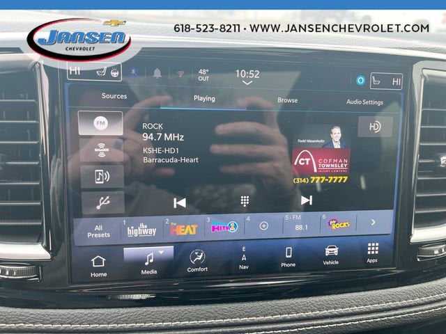 2025 Chrysler Pacifica LimitedClean CARFAX. CARFAX One-Owner.19/28 City/Highway MPGThe Jansen Advantage: Complimentary Carfax on all vehicles, Complimentary Service Loaners, Complimentary Oil Change, Service Rewards Program, and Complimentary Local Pickup and Delivery.Jansen Chevrolet has been in business since 1927. The foundation of our business is customer service. We strive to treat every customer with courtesy and respect, that's why our motto is Come as a Customer, Leave as a Friend! Give us a chance to show you why we have been around for nearly 100 years.13 Speakers, 3.25 Axle Ratio, 3rd row seats: split-bench, 4-Wheel Disc Brakes, ABS brakes, Air Conditioning, Alloy wheels, AM/FM radio: SiriusXM 360L, Apple CarPlay/Android Auto, Audio memory, Auto-dimming Rear-View mirror, Automatic temperature control, Black Seats, Brake assist, Bumpers: body-color, Compass, Cruise Control, Delay-off headlights, Driver door bin, Driver vanity mirror, Driver's Seat Mounted Armrest, Dual front impact airbags, Dual front side impact airbags, Electronic Stability Control, Emergency communication system: Chrysler Connect, Four wheel independent suspension, Front anti-roll bar, Front Bucket Seats, Front dual zone A/C, Front fog lights, Front reading lights, Fully automatic headlights, Garage door transmitter, Heated door mirrors, Heated front seats, Heated rear seats, Heated steering wheel, Illuminated entry, Integrated Active Noise Cancellation, Knee airbag, Low tire pressure warning, Manufacturer's Statement of Origin, Memory seat, Nappa Leather Bucket Seats with S Logo, Navigation System, Occupant sensing airbag, Outside temperature display, Overhead airbag, Overhead console, Panic alarm, ParkView Rear Back-Up Camera, Passenger door bin, Passenger seat mounted armrest, Passenger vanity mirror, Power door mirrors, Power driver seat, Power Liftgate, Power moonroof, Power passenger seat, Power steering, Power windows, Quick Order Package 27P, Radio data system, Radio: Uconnect 5 Nav with 10.1 Display, Rain sensing wipers, Rear air conditioning, Rear reading lights, Rear window defroster, Rear window wiper, Reclining 3rd row seat, Remote keyless entry, Roof rack, Security system, Split folding rear seat, Spoiler, Steering wheel mounted audio controls, Tachometer, Telescoping steering wheel, Tilt steering wheel, Touring Suspension, Traction control, Trip computer, Turn signal indicator mirrors, Variably intermittent wipers, Ventilated front seats, Voltmeter, Wheels: 20 x 7.5 S-Model Aluminum Design 1.